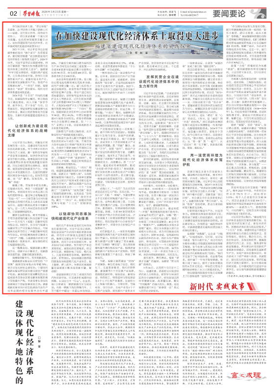 3月23日,进修时报第02版刊发了福建日报、进修时报结合推出文章《正在加速扶植现代化经济系统上取得更大前进——福建省扶植现代化经济系统的实践摸索》。文章聚焦福建让立异成为扶植现代化经济系统的计谋支持、以链群协同思维加速建立现代化财产系统、阐扬平易近营企业正在扶植现代化经济系统中的生力军感化、用一流营商为现代化经济系统保驾护航。一路来看详情——